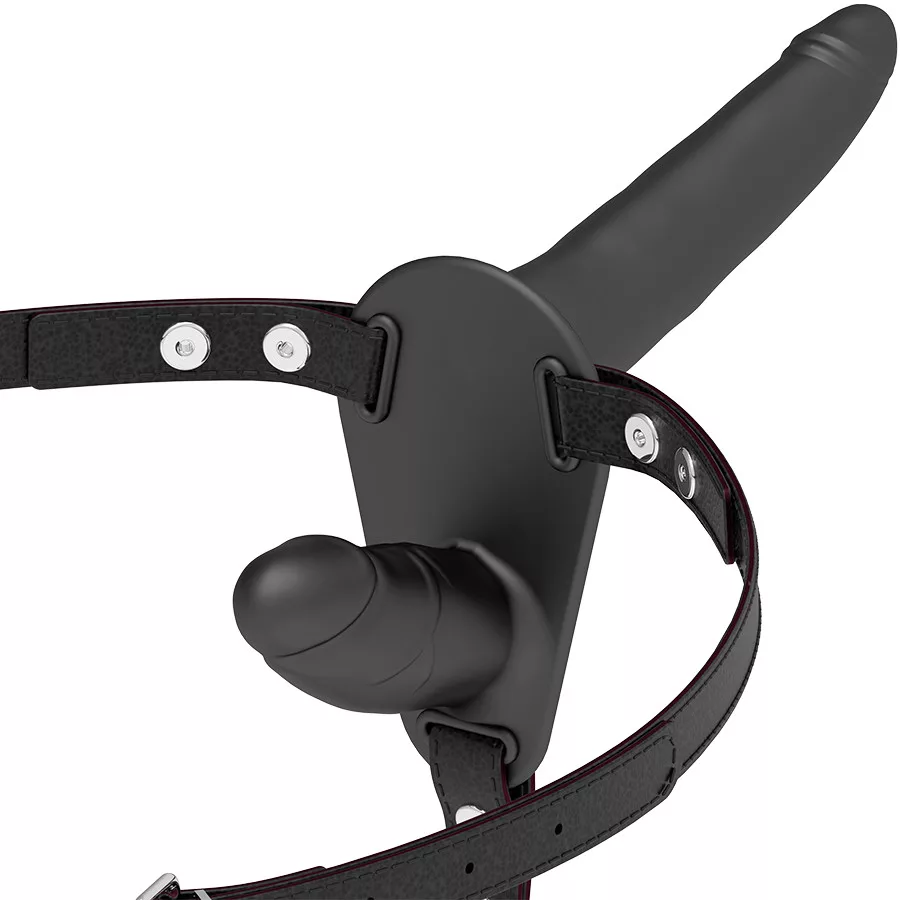 Dupla behatolású hám, amely bármilyen csípőméretre állítható, még a legnagyobbra is. A dildo prémium szilikonból készült.