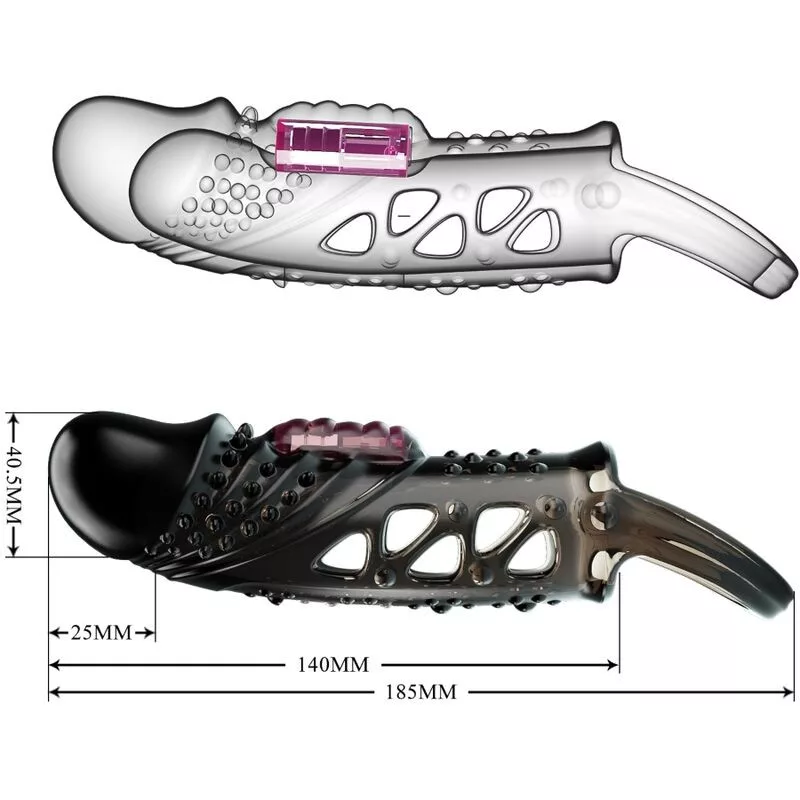 Jó szórakozást ezzel a rezgő péniszujjal. Ez a merevedést erősítő és örömet ígérő péniszhüvely puha TPR-ből készült, és egy golyóhurokkal rögzítve van a helyén. A csúcsán lévő vibrátor végignyúlik a pénisz hosszán, és érintéskor aktiválódik. A szár fejének stimulálásával belső stimulációt is biztosítasz neki. A rugalmas ujj körbefonódik a péniszedre, így erősebb, hosszabb ideig tartó merevedést kapsz, így több időd van élvezni a rezgéseket!