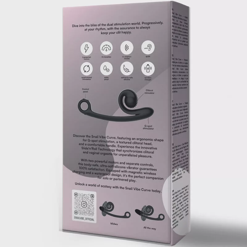 Fedezd fel a Snail Vibe Curve-t, amely ergonómiai formával rendelkezik a G-pont stimulációhoz, textúrázott csiklófejet és kényelmes nyélet. Tapasztald ki az innovatív Slide'n'Roll technológiát, amely szinkronizálja a csikló- és hüvelyi érzékenységet párodik öröm érdekében.