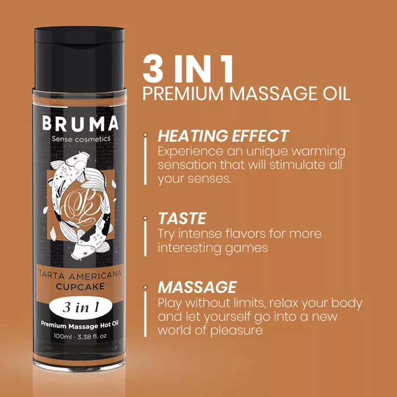 A BRUMA márka Premium Heat Effect Massage Oil cupcake íze igazi gyöngyszem a jóllét és az intimitás világában. Ez a kifinomult termék, amely elegáns 100 ml-es dobozban jelenik meg, egyedi és érzéki élményt nyújt, lazító és stimuláló masszázst nyújtva egy kis melegséggel, ami még különlegesebbé teszi. itt vannak a részletesen kidolgozott kiemelt elemek: