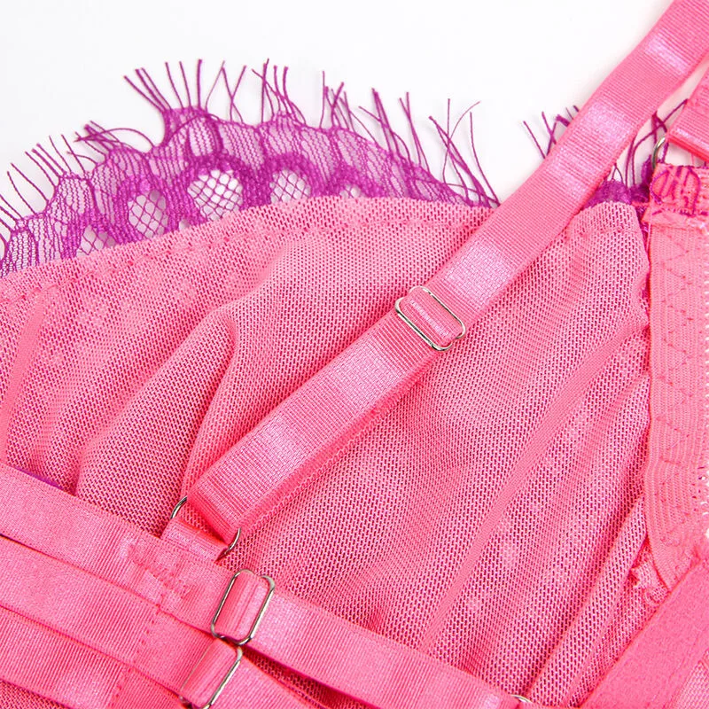 SUBBLIME – 955359 MELLTARTÓ KÉSZLET CSIPKÉVEL ÉS HARISNYAKÖTÉSSEL, RÓZSASZÍN ÉS LILA S/M