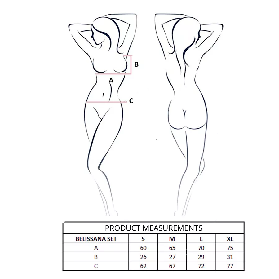 A BELISSANA készlet ötvözi az érzékiséget és a modern eleganciát, olyan nők számára tervezve, akik minden részletben értékelik a finom szépséget és a luxust. Teljesen finom, átlátszó poliamidból készült, könnyedségével és finomságával lenyűgöző, miközben kiemeli a test természetes szépségét.
