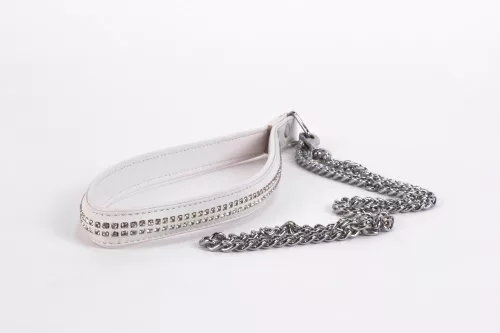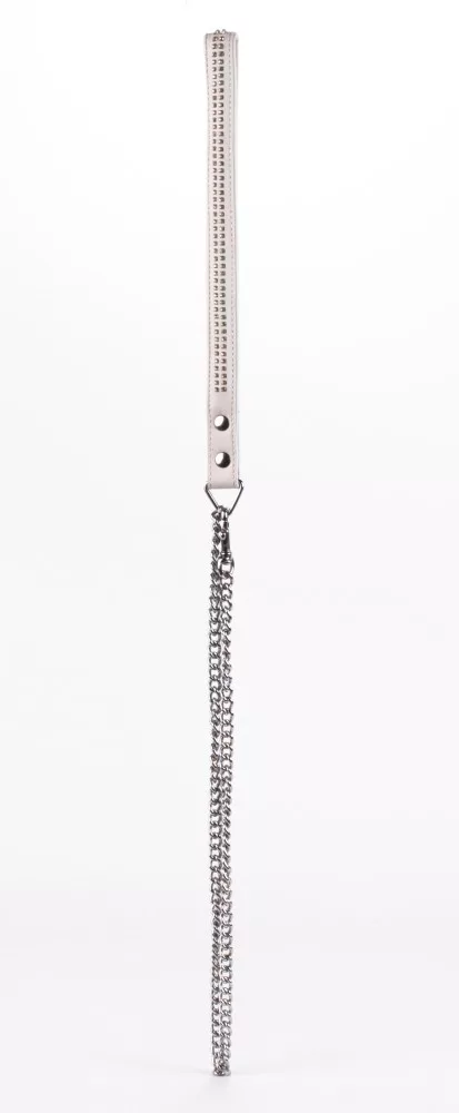 Nyakra helyezhető erotikus fetish játék és egy hozzá tartozó póráz, 2 sor strasszal díszítve. A lánc hossza 34 cm.