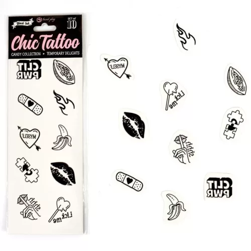 Fedezd fel a vágyak világát a SECRET PLAY édességgyűjtemény ideiglenes tetoválásaival! Ezek a 10 különböző, csábító mintázattal rendelkező tetoválás garantáltan feldobják az estéidet és izgalmassá teszik a különleges pillanatokat. Hozd ki a legjobbat a szenvedélyedből, és élvezd a játékos felnőtt szórakozást stílusosan!