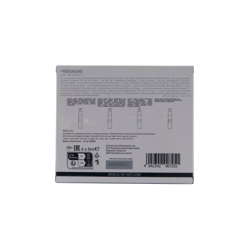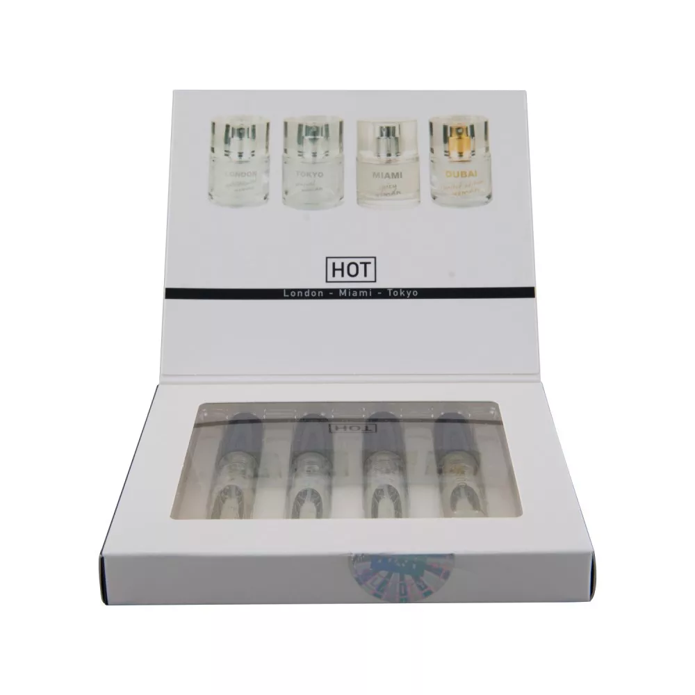 A csomag tartalma: 5 ml London, Dubai, Miami és Tokyo feromonos parfüm.
