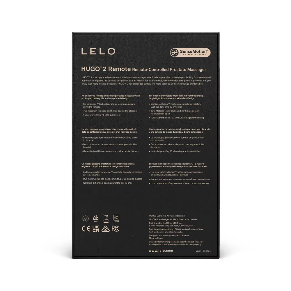 Anatómiailag tökéletesen formált, 6 rezgési és 2 SenseMotion (mozgásra reagáló) funkcióval rendelkező, két motorral felszerelt, távirányítós prosztata és perineum masszírozó, ideális íves kialakítással, kiszélesedő talppal a biztonságos behatolásért. A távirányító segítségével lehet a rezgéseket szabályozni: vízszintes állásban gyengédebben, megdöntött állásban pedig erőteljesebben rezeg. A távirányító hatótávolsága 12 méter. A Hugo 2 nagyobb teljesítménnyel és hosszabb töltési idővel rendelkezik, mint az előző verziója.