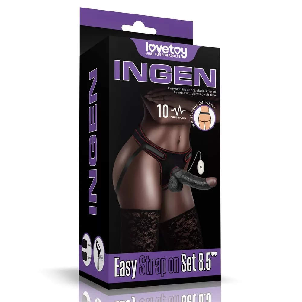 Kiváló minőségű anyagból készített, realisztikus kialakítású, puha, rugalmas, erezett felületű, herékkel kiegészített, 2 sebességi és 8 vibrációs fokozattal rendelkező, vezetékes távirányítóval is szabályozható dildó, állítható tépőzárral és rugalmas hevederekkel rendelkező hámmal. A hám 60 és 143 cm közötti derékméretekhez alkalmas. A dildó felcsatolás nélkül is használható, tapadókorongja segítségével sík felületen rögzíthető.