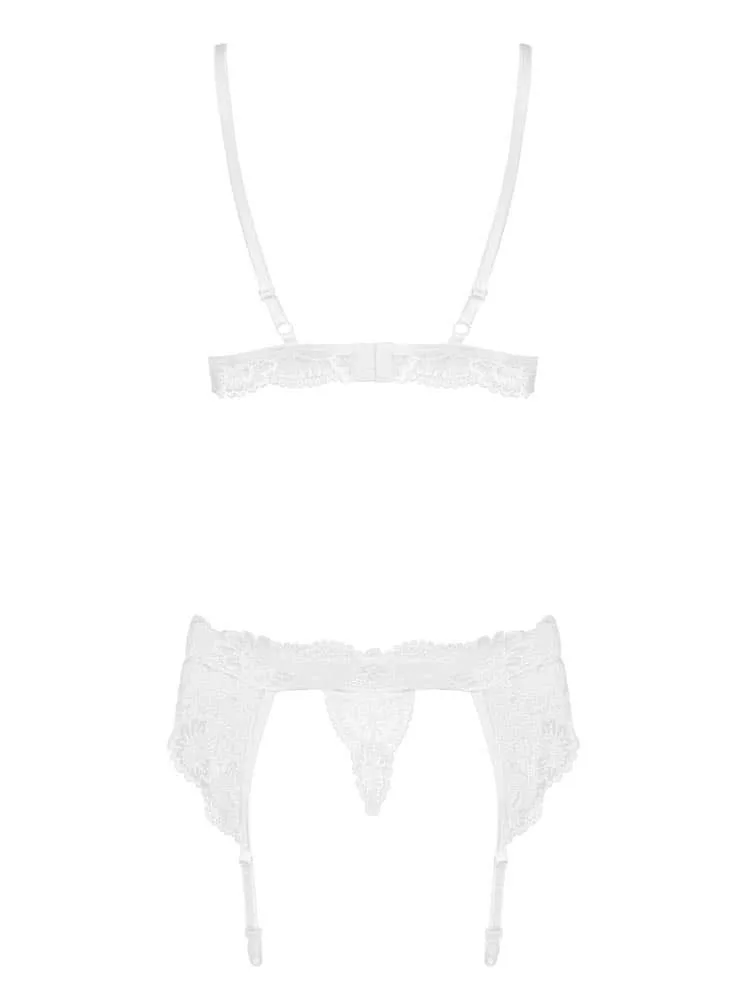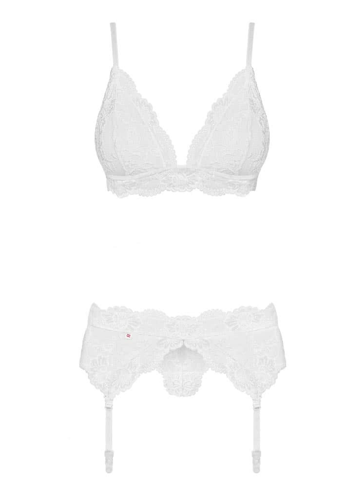 Elasztikus anyagból készített szett, mely melltartót, harisnyakötőt és tangát tartalmaz. A harisnya nem része a csomagnak.
