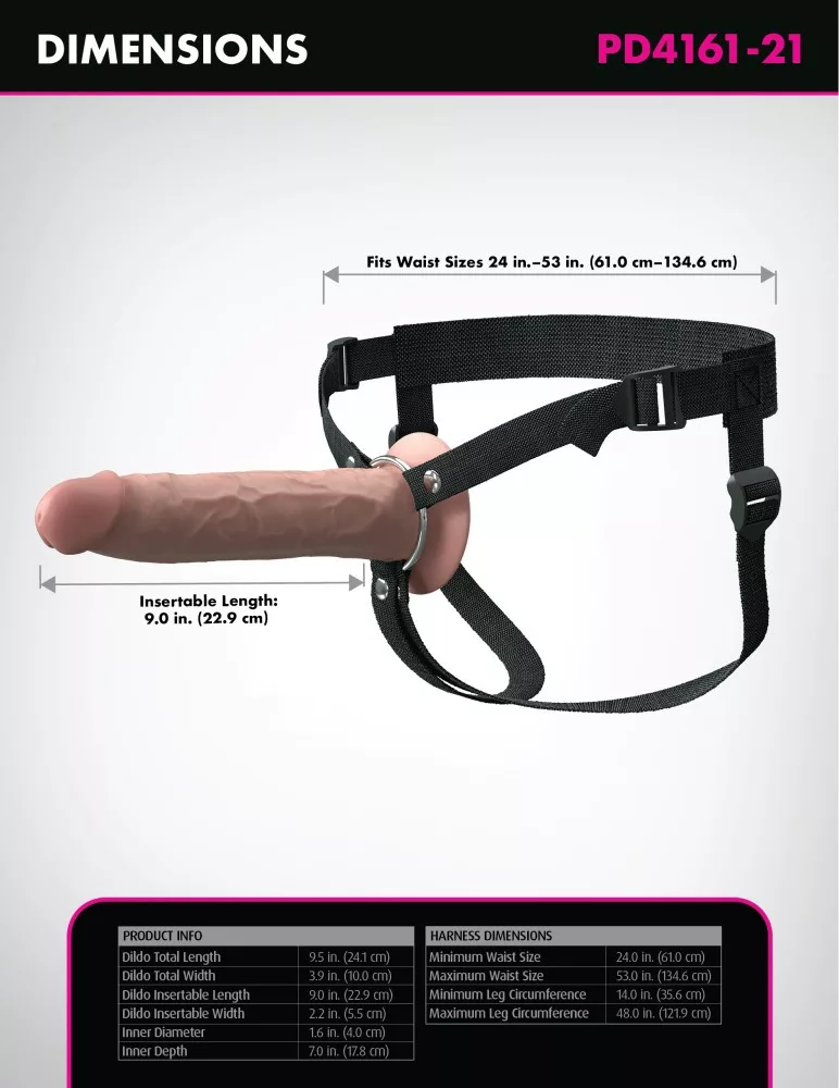 Bőrbarát anyagból, férfiaknak készített, üreges, saját péniszre is helyezhető, erezett felületű, realisztikusan kialakított dildó, rugalmas övvel és pántokkal.  A hám 61 és 134,6 cm derékbőségek között állítható. A puha, állítható pántok egyszerűek, az 5,08 cm-es fém O-gyűrűk pedig könnyen fel- és levehetők.
