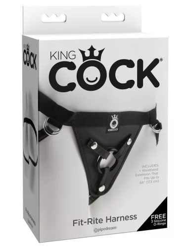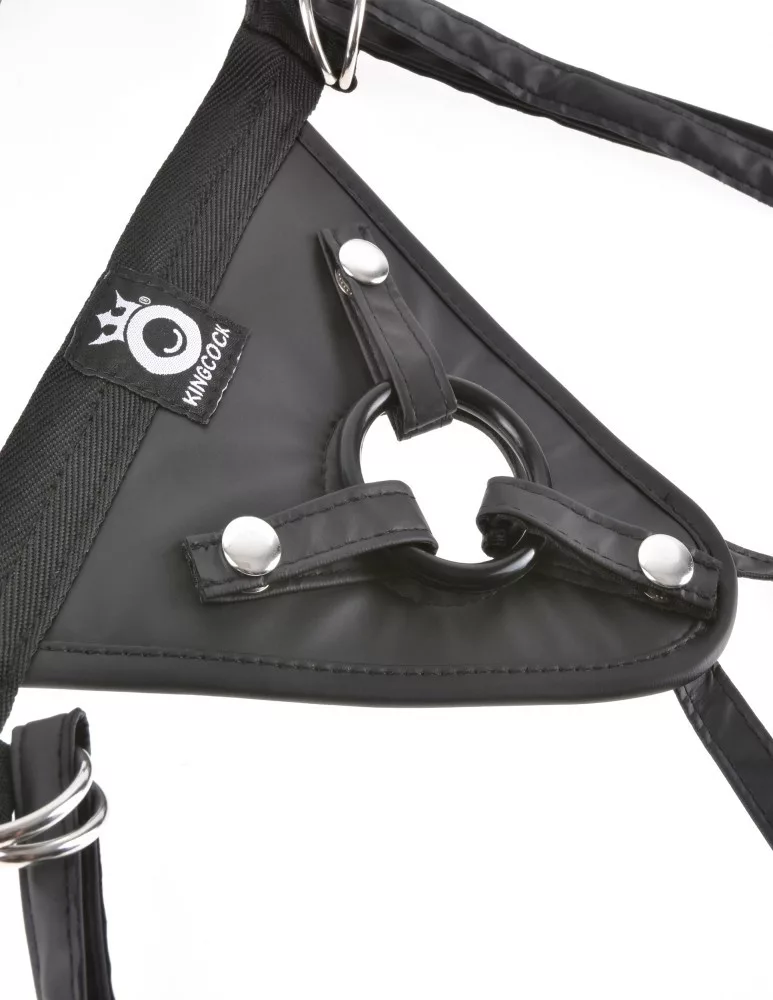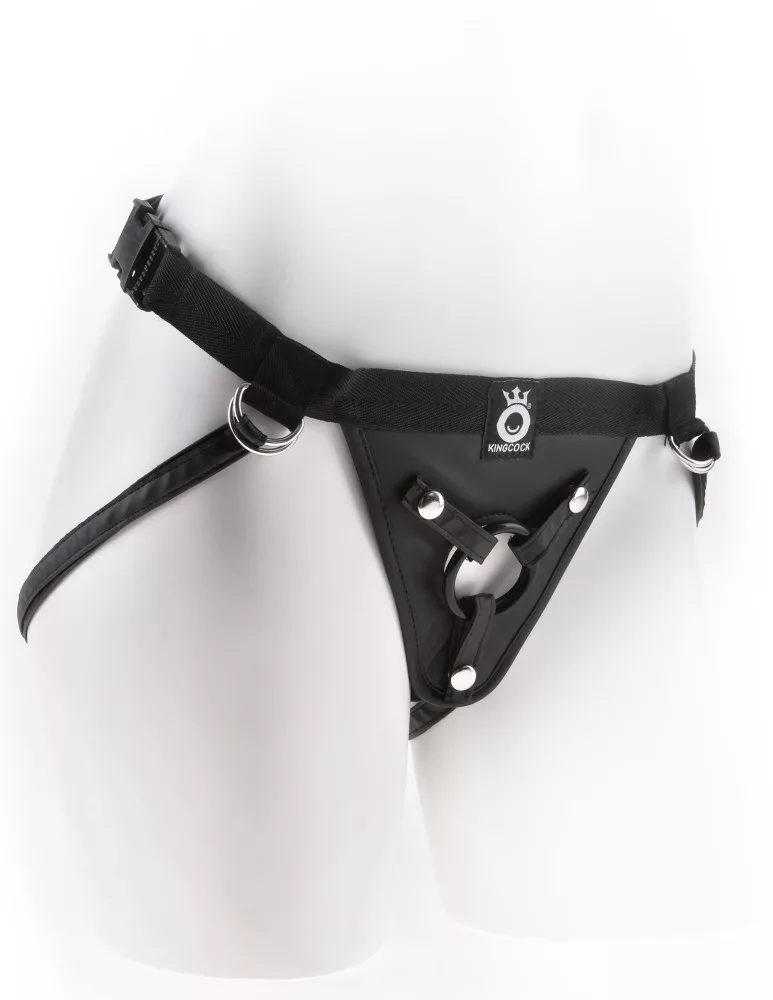 Imbracatura in sintetica pelle progettata per l'uso di prodotti strap-on, universale, raccomandata sia per donne che per uomini. La circonferenza massima della cinghia è di 97 cm, mentre quella massima delle fasce per la coscia è di 76 cm. La confezione include tre anelli in silicone intercambiabili di diametri diversi: 4cm, 5cm e 6cm.