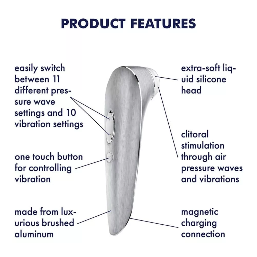 Prémium minőségű, luxus kategóriájú, ergonómiailag tervezett, csiszolt alumínium borítású, léghullámos és vibrációs működésre is kialakított, könnyen kezelhető izgató. 11 léghullámos és 10 rezgési funkcióval rendelkezik, a stimulációs módok egymástól függetlenül is használhatóak.