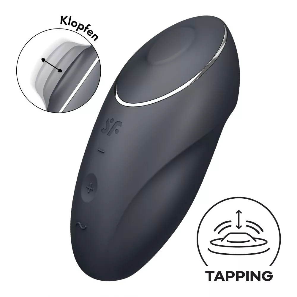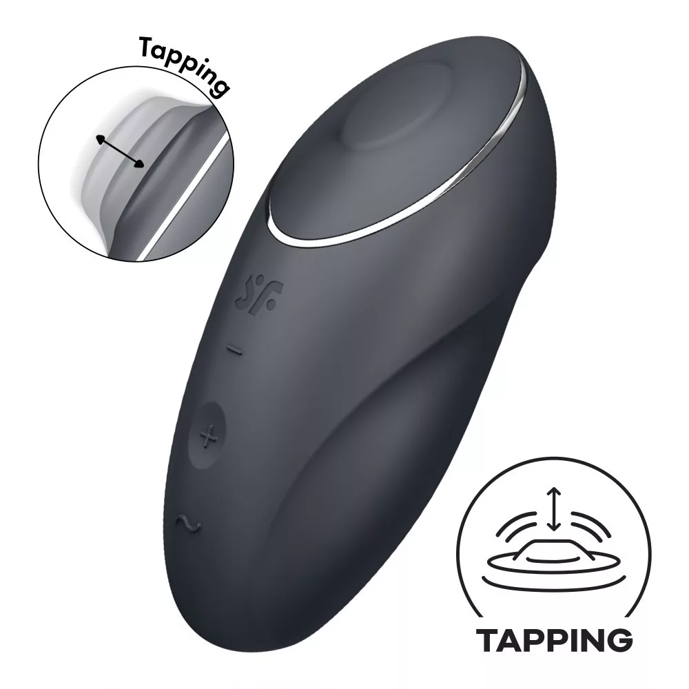 A kiváló minőségű, bőrbarát anyagból készített, két motorral felszerelt Satisfyer Tap & Climax 1 mindent tartalmaz, amit Ön egy izgatótól elvár: elegáns dizájn, kompakt méret és természetesen intenzív rezgések, amelyeket az előlapon található gombokkal könnyedén irányíthat. Válasszon 11 vibrációs program közül a gyengédtől az intenzívig. Ez a Satisfyer eszköz azonban még többet kínál annak érdekében, hogy a csikló stimulációt a következő szintre emelje! A 11 további koppintó programmal a Satisfyer Tap & Climax 1 gyengéden – vagy néha kicsit erőteljesebben – koppint a csiklójára, és teljesen új típusú izgalmakat kínál.