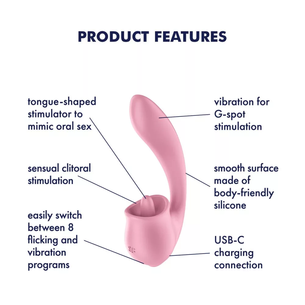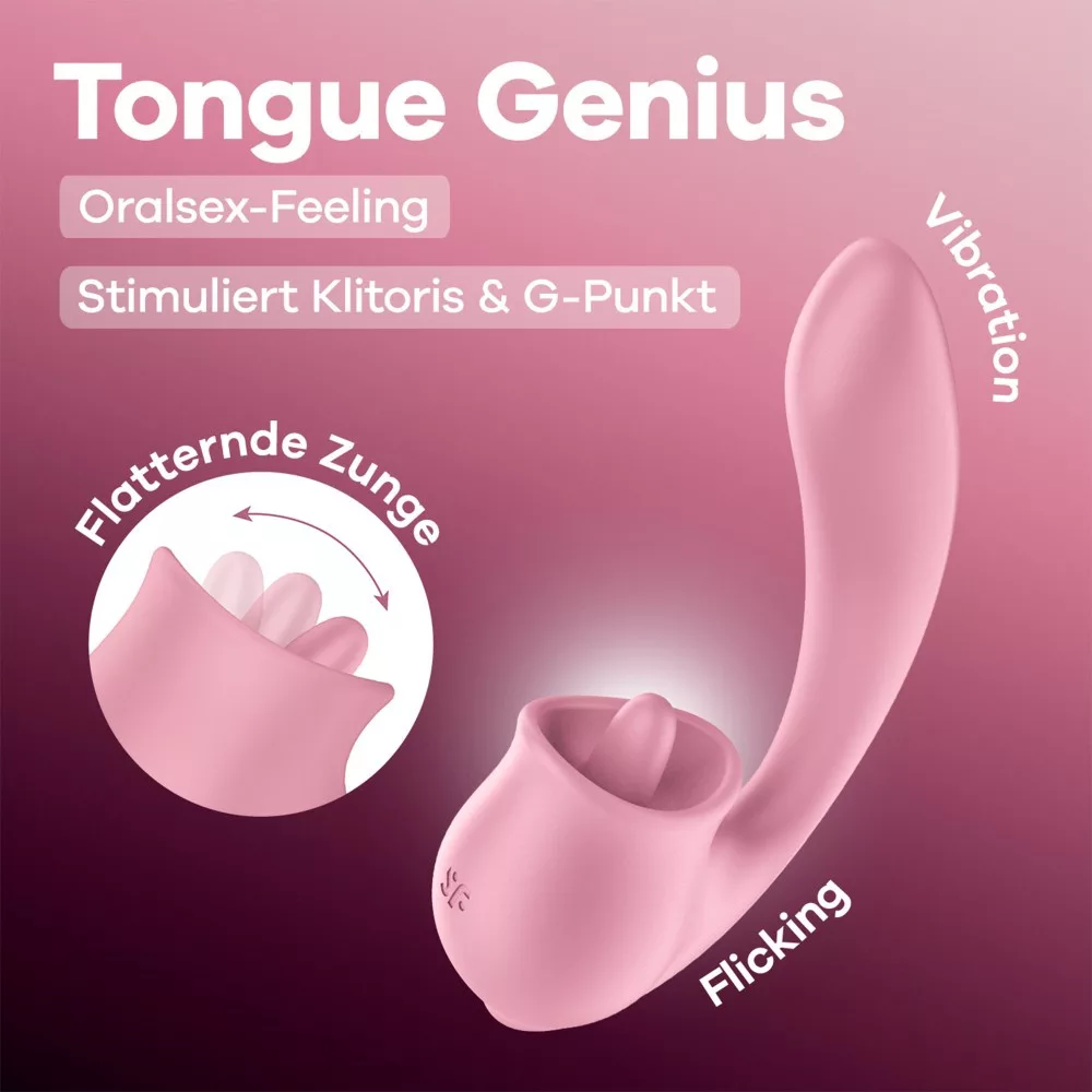Che sia per piacere esterno che interno – questo giocattolo d'amore sa esattamente cosa fare. Con 8 modalità di leccata e 8 programmi di vibrazione, il Tongue Genius stimola contemporaneamente clitoride e punto G, garantendo un orgasmo duraturo. La linguetta rigida in silicone imita movimenti realistici, mentre l'asta ergonomicamente curva mira con precisione il punto G.