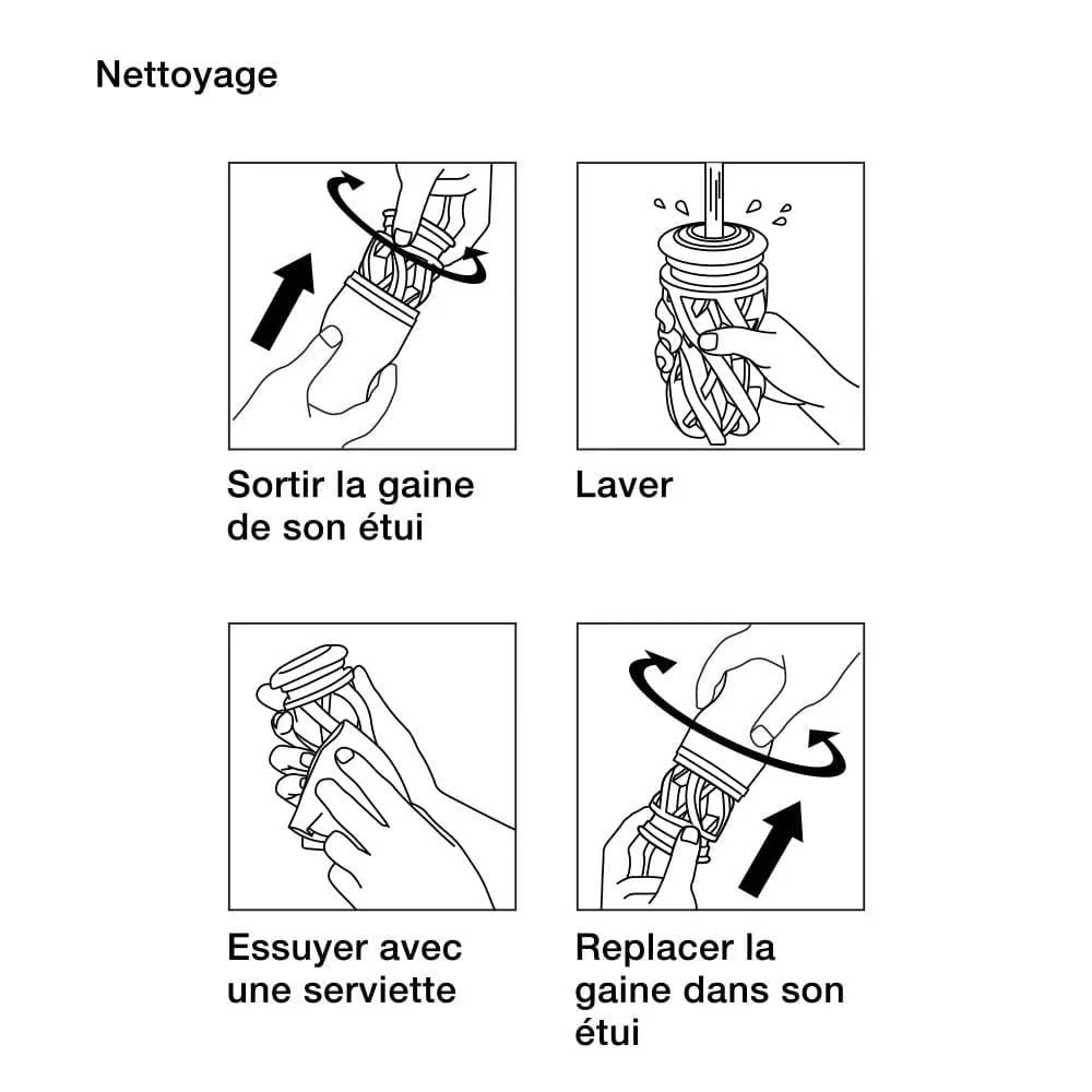Tisztítása : minden használat előtt és minden használat után a betétet a tokból kivéve langyos szappanos vízzel és segédeszköz tisztítóval kell elmosni. Vízbázisú síkosító javasolt, melyből egy mintát a csomag tartalmaz.